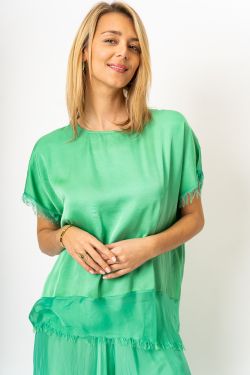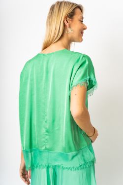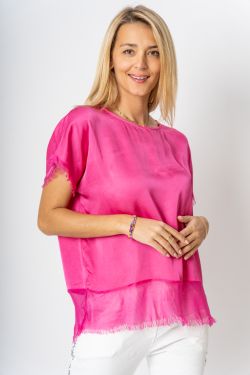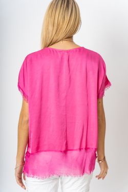 Short Sleeve Silk Layered Top. Silk ruffle he, short sleeve, round neckline, solid color on front and back.