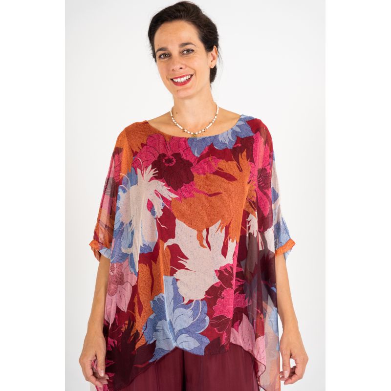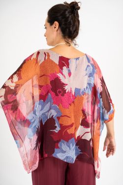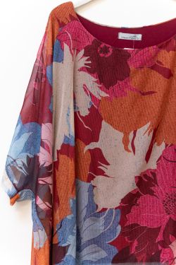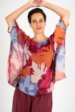 Multi-Colored Flower Print Blouse. 3/4 length wide sleeve, fully lined, round neckline, print on front and back.