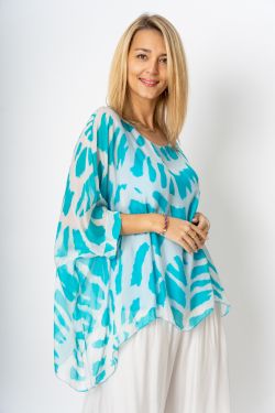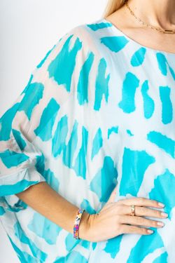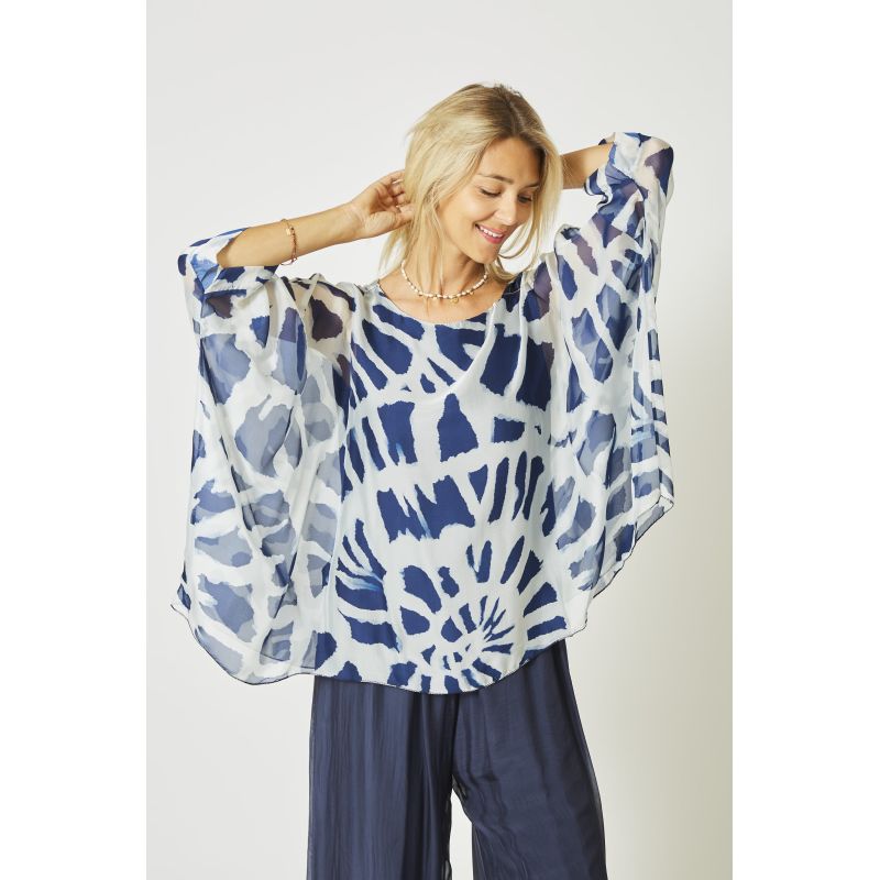 Swirl Print Silk Blouse. Round neckline, print on front and back, wide open sleeve, fully lined.