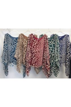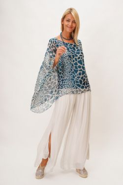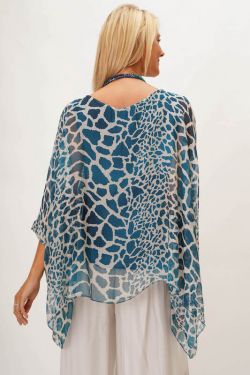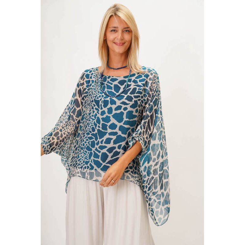 Giraffe Print Silk Blouse. Rounded neckline, kimono sleeve, lined.