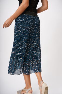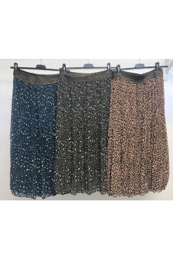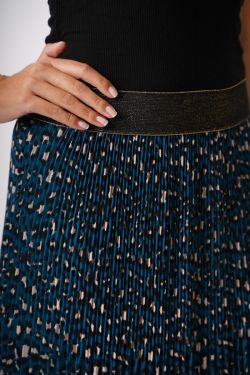 Cheetah Print Pleated Midi Skirt. Elastic waistband with glitter detail, pleats full length of skirt, pattern on front and back, lined.