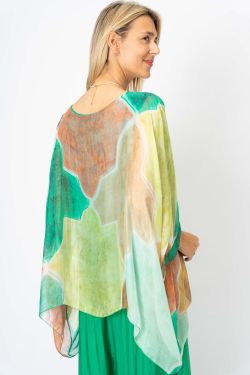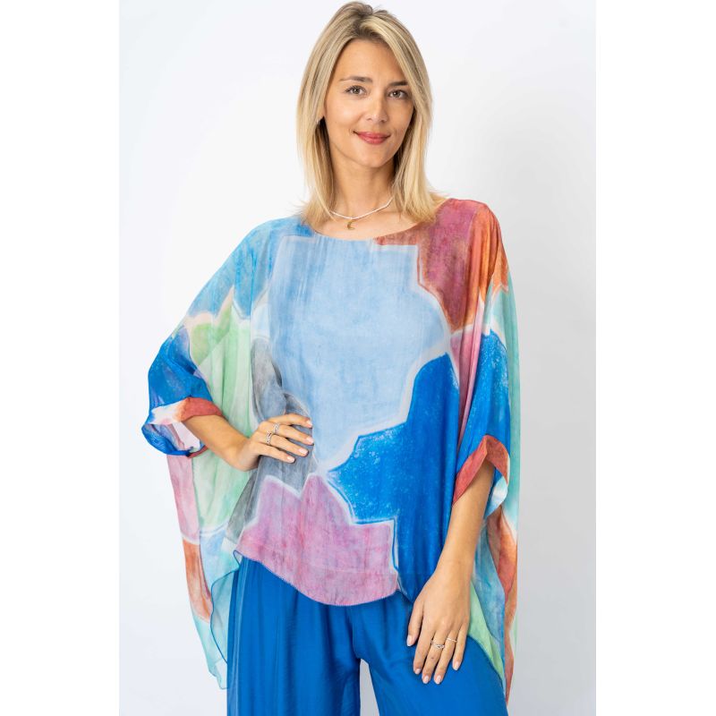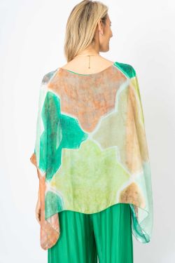 Mosaic printed silk blouse. Wide short sleeve, lined, print on front and back, scoop neckline.