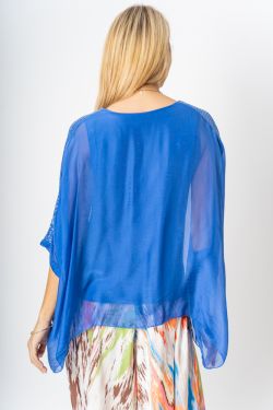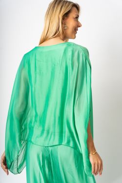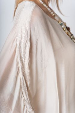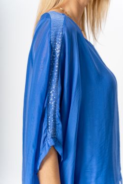 Silk Blouse w/ Sequin Sleeve. Clear Sequins down shoulder seams, round neckline, wide sleeve, lined, solid color on front and back.