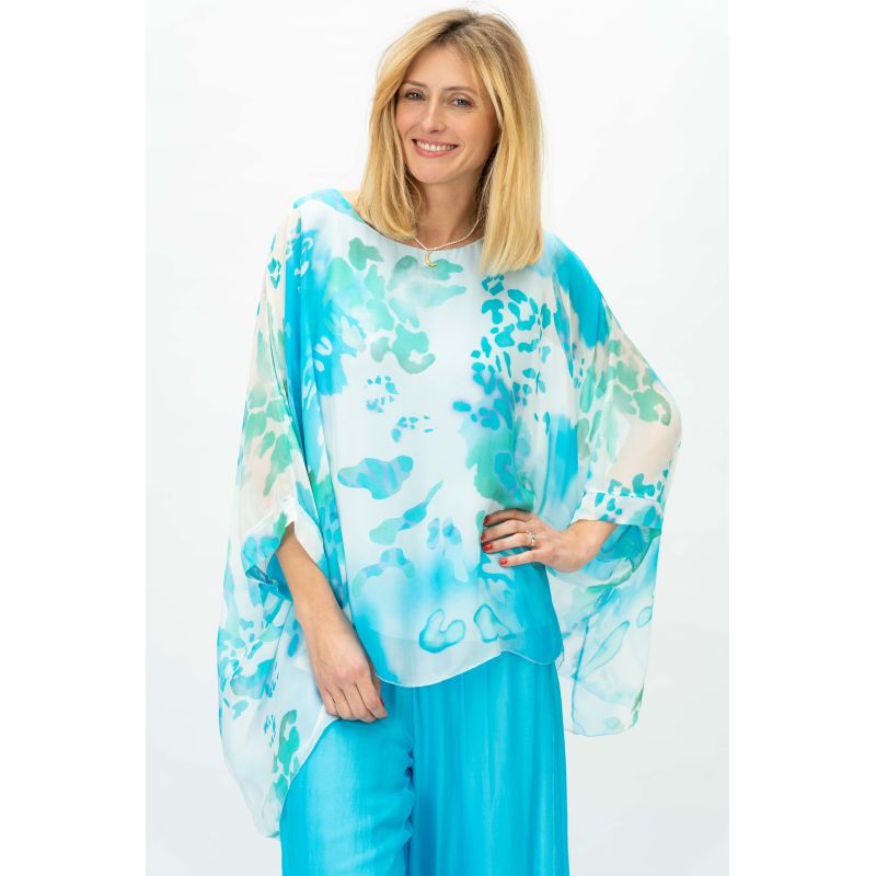 "SK" abstract print Silk Blouse.Wide kimono sleeve, round neckline, lined, print on front and back.