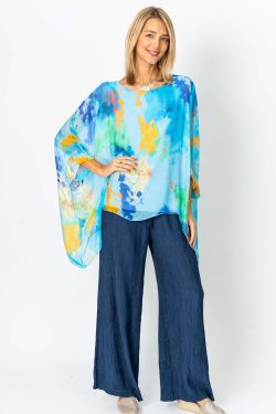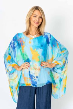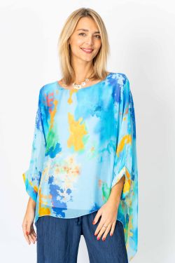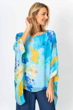 "Splash" printed silk blouse. Rounded neckline, kimono sleeve, lined.