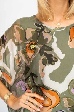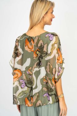 Flowers Printed Silk Blouse. Elbow length sleeves. Lined.