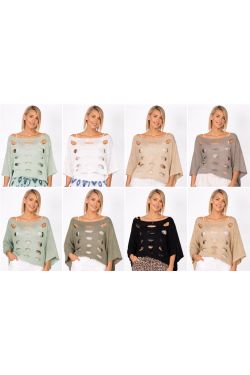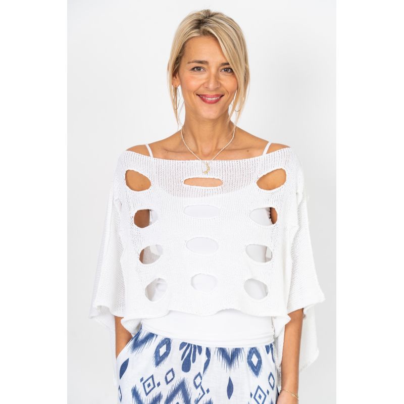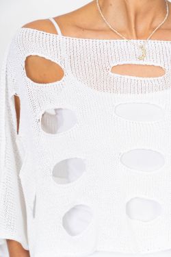 Modern and effortlessly edgy, this Italian-made sweater top features a bold open-knit design with distressed cutout details for a contemporary statement look. The oversized silhouette and airy construction make it a perfect layering piece for transitional and warm-weather styling.
