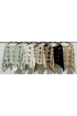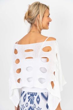 Designed with a relaxed drape and wide sleeves, this top offers both comfort and versatility. The cropped length pairs easily with high-waisted bottoms, while the open knit and cutouts add texture and a fashion-forward appeal.