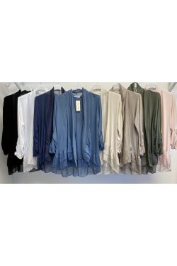 Medium size cardigan. Cotton with silk ruffle. Bottom up sleeves.