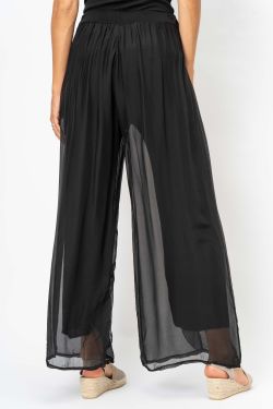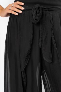 Silk Pant ruffle detail on front. Elastic waistband and tie front. open hem, fully lined