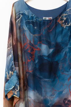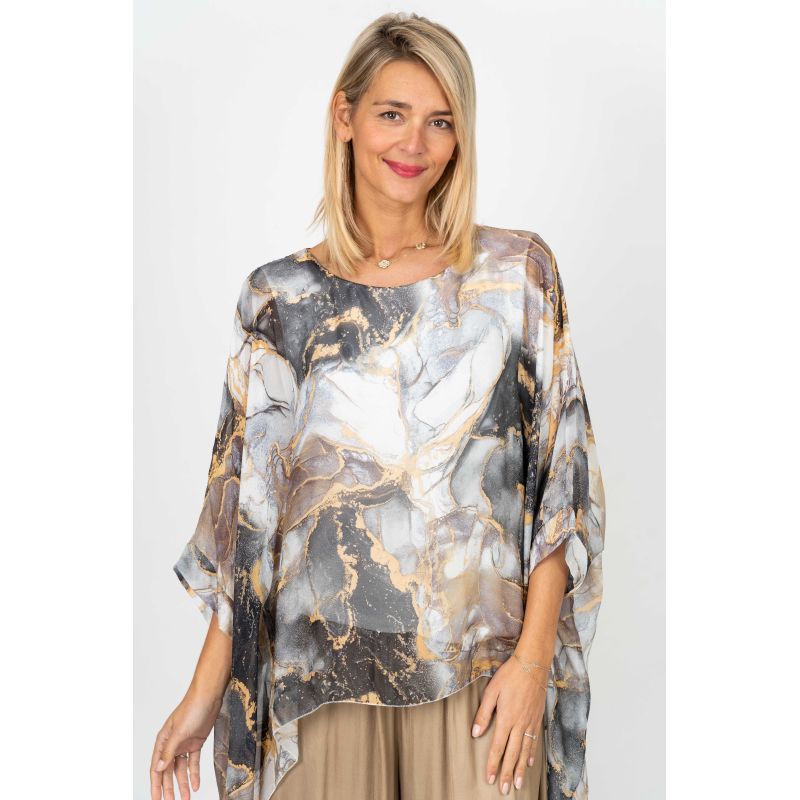 Marble Print Silk Blouse. Round neckline, short wide sleeve, lined, print on front and back.